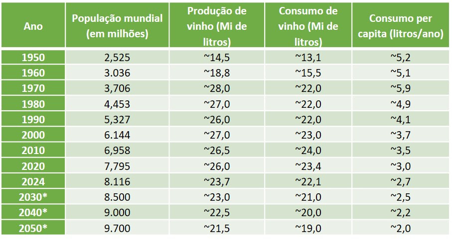 Ao analisarmos os dados da tabela abaixo, elaborada com base nas estatísticas mundiais da Organização Internacional da Vinha e do Vinho (OIV), veremos que o consumo per capita mundial caiu de 5,9 litros por pessoa/ano na década de 70 para 2,7 litros per capita/ano em 2024. Nos primeiros anos deste terceiro milênio, o consumo total até aumentou, mas não acompanhou o aumento populacional.