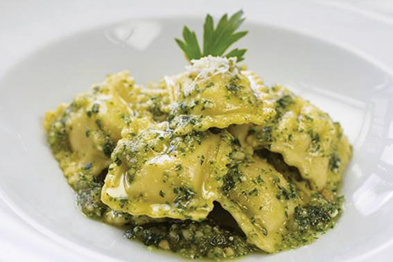 Colocar a água para ferver, acrescentar o ravióli e deixar cozinhar conforme as orientações do fabricante. Deixe escorrer a água e reserve. Molho Pesto: bata no liquidificador o sal, a pimenta, o alho, a cebola, o vinagre branco, o azeite, o manjericão e a água. Sirva o ravióli no prato e regue com o molho pesto. Decore com algumas folhas de manjericão fresco.